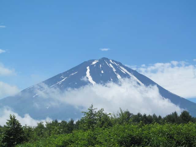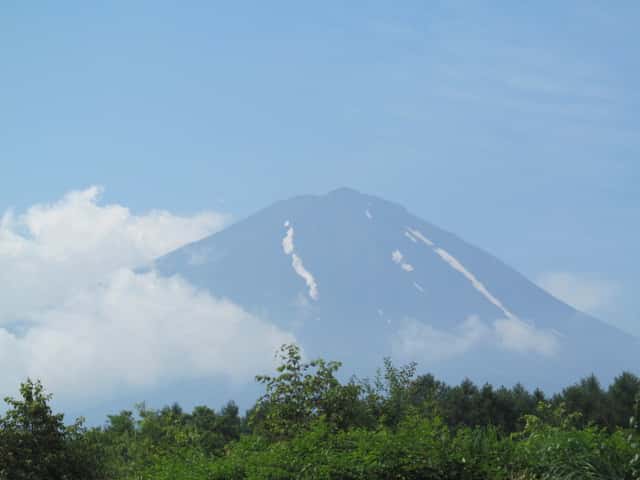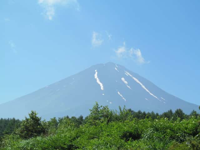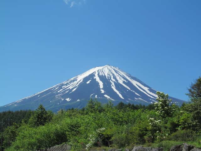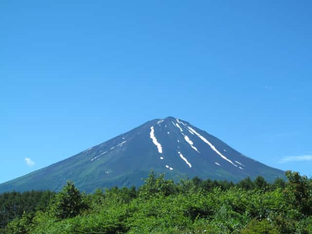 青空や木々の緑に綺麗に映える富士山。